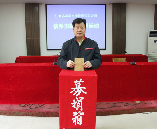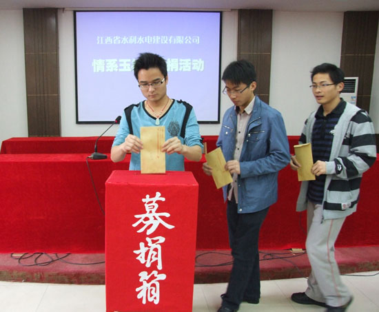 2010年4月14日,青海省玉樹縣發(fā)生兩次地震,最高震級7.1級,造成了當地巨大的人身傷亡和財產損失,“玉樹地震”牽動著億萬人民的心,也牽動著我司所有員工的心!公司在全司范圍內積極開展“情系玉樹募捐活動”,4月26日,我公司南昌市機關總部首先開展了“情系玉樹募捐活動”,公司中層以上管理人員和員工踴躍參與募捐活動,紛紛獻上自己的一份愛心,體現(xiàn)出江西水總人的社會責任感!同時,各分公司、國內外施工項目部也在開展此項活動,預計此項活動將募得資金3萬余元。