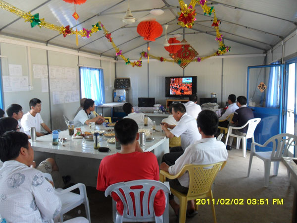 “金虎辭舊歲,玉兔迎新春”。2月2日,在祖國舉國歡慶,萬家團聚的時候,項目經(jīng)理候學剛首先致辭。隨后,公司副總經(jīng)理黃鄭民轉達了公司董事長、總經(jīng)理王元旦同志向戰(zhàn)斗在國外的同志們的親切問候和良好祝愿,并總結了一年來項目部取得的可喜成績,對2011年寄于主體工程基本完工的希望,相信灌溉項目一定會是安全的、高效的。