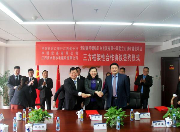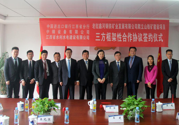 12月29日上午,在江西省商務廳副廳長方向軍、外經(jīng)處處長王健的見證下,公司與中國進出口銀行江西省分行和中鋼設(shè)備有限公司就老撾鑫河鋼鐵礦業(yè)發(fā)展有限公司爬立山鐵礦建設(shè)項目正式簽訂三方框架性合作協(xié)議。中國進出口銀行江西省分行行長鄭麗、中鋼設(shè)備有限公司總經(jīng)理王建、公司董事長王元旦、海外公司總經(jīng)理黃鄭民等出席簽約儀式。