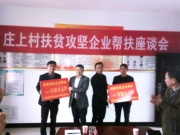 為認(rèn)真貫徹落實(shí)黨的十九大關(guān)于堅(jiān)決打贏脫貧攻堅(jiān)戰(zhàn)的新部署新要求,踐行企業(yè)的社會(huì)責(zé)任。11月17日,公司副總經(jīng)理王俊華同志率撫州廖坊灌區(qū)二期工程施工總部負(fù)責(zé)人胡福民、項(xiàng)目財(cái)務(wù)部負(fù)責(zé)人肖志兵代表江西省水利水電建設(shè)有限公司前往南城縣洪門鎮(zhèn)參加莊上村扶貧攻堅(jiān)企業(yè)幫扶座談會(huì),并將公司捐助的10萬(wàn)元扶貧資金送至莊上村村委會(huì)。